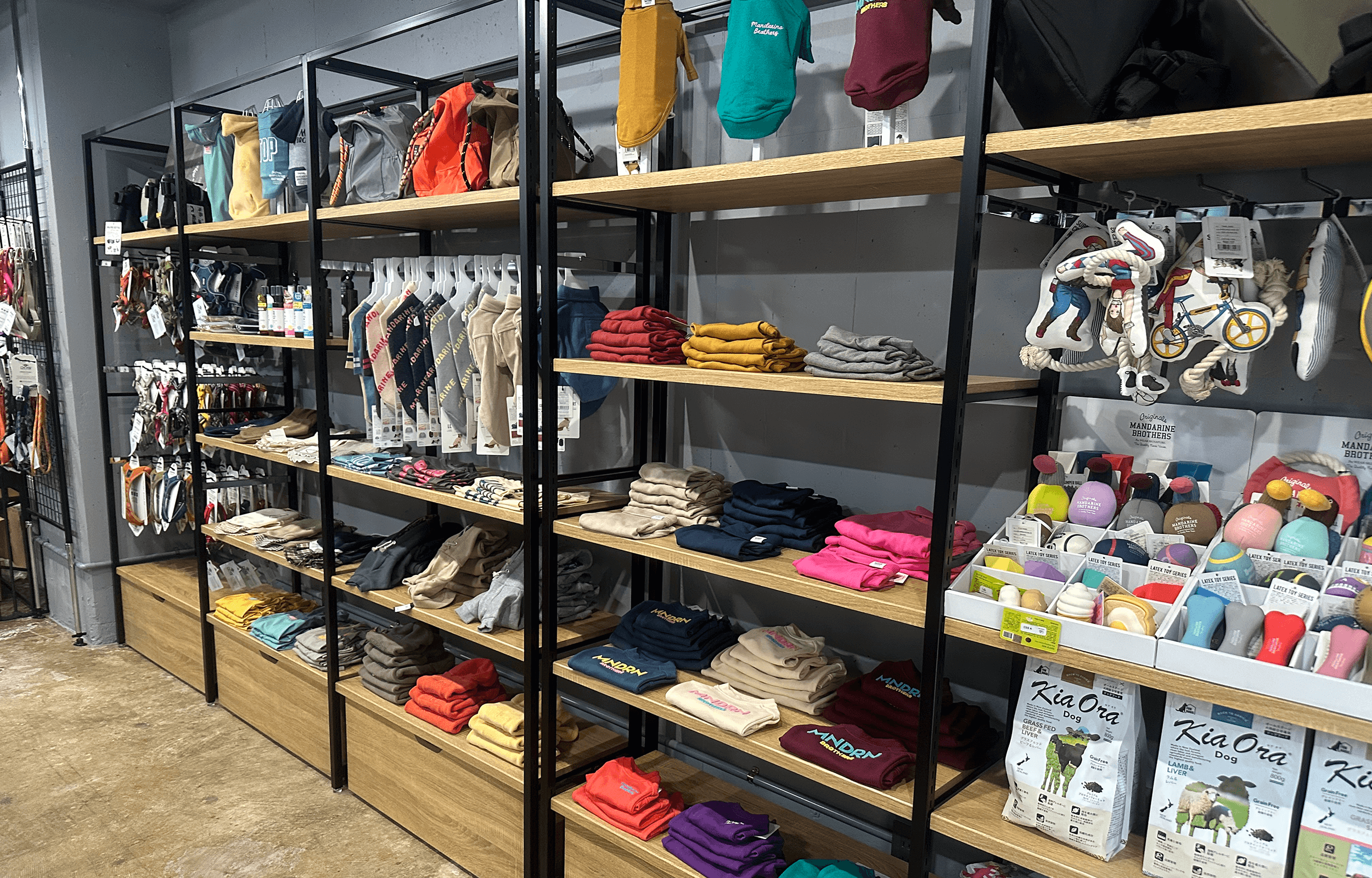 駅前の商店街から少し離れた公園のそばに佇む実店舗では、「お散歩途中に楽しく立ち寄れる、愛犬のための行きつけのお店」をコンセプトに、飼い主さんだけでなくわんこ達にとっての心地よい空間づくりを大切にしています。