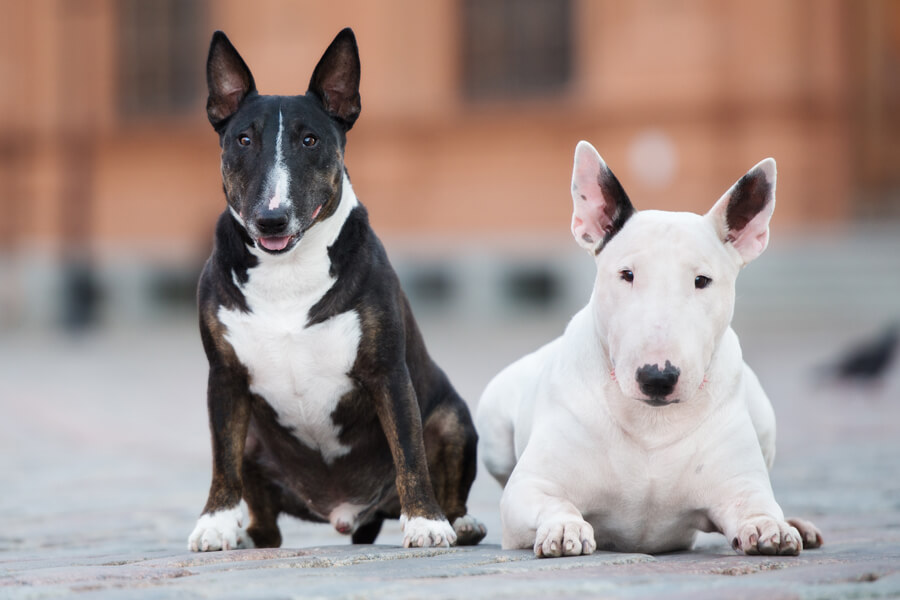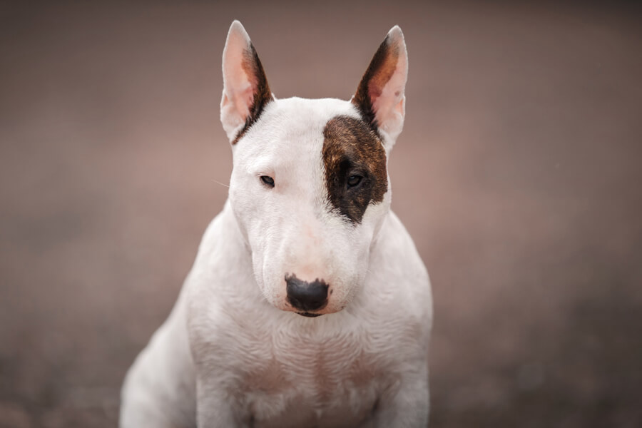 ブル・テリアには、ホワイトのボディに特徴的な有色の班が入ります。