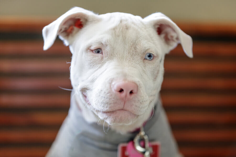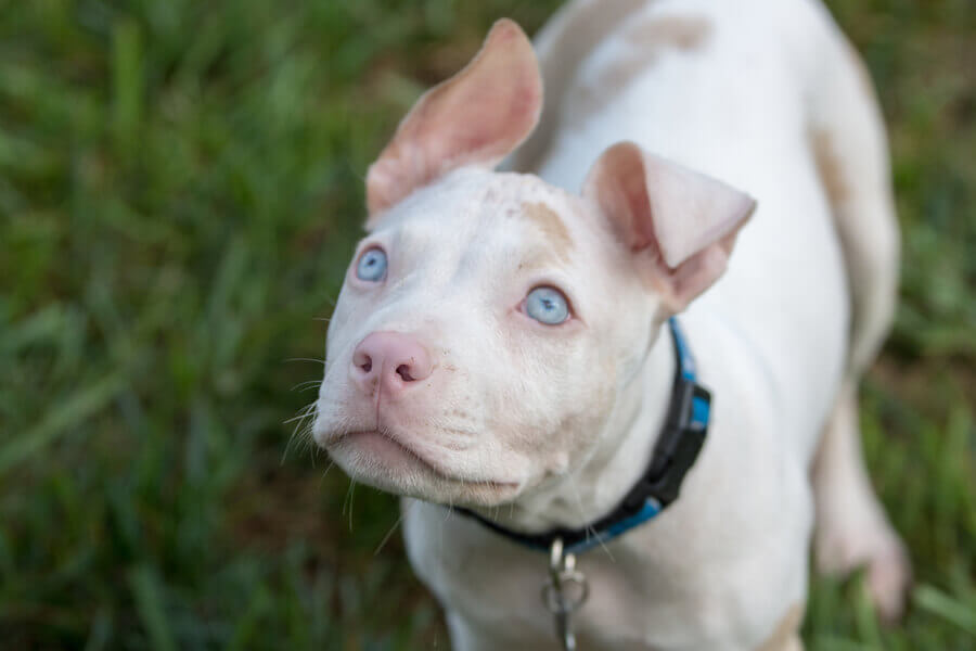 白い被毛に、透き通った瞳の美しく珍しい外見を持つアルビノ犬。