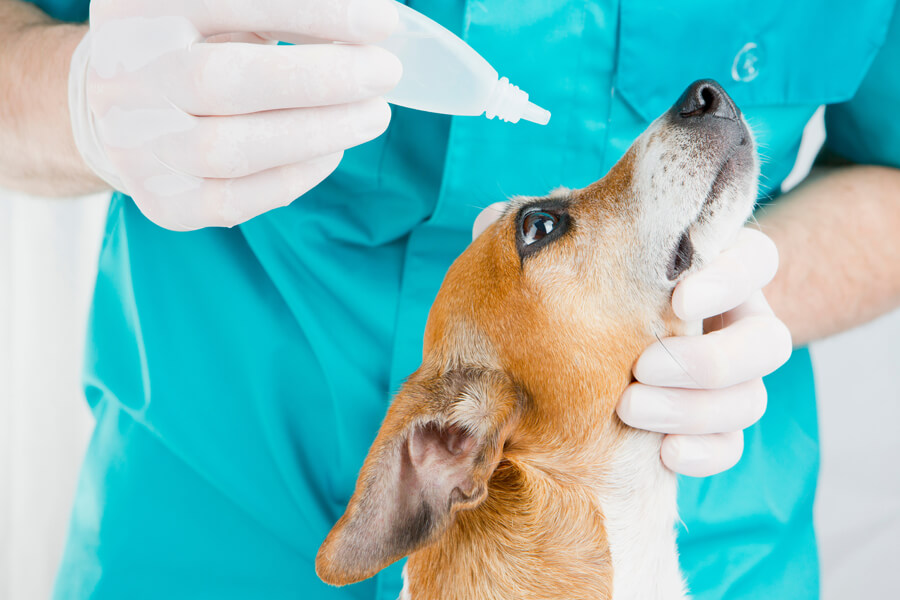 動物病院では、生理食塩水などで目の中をキレイに洗い流し、上記作用のある点眼薬をさします。