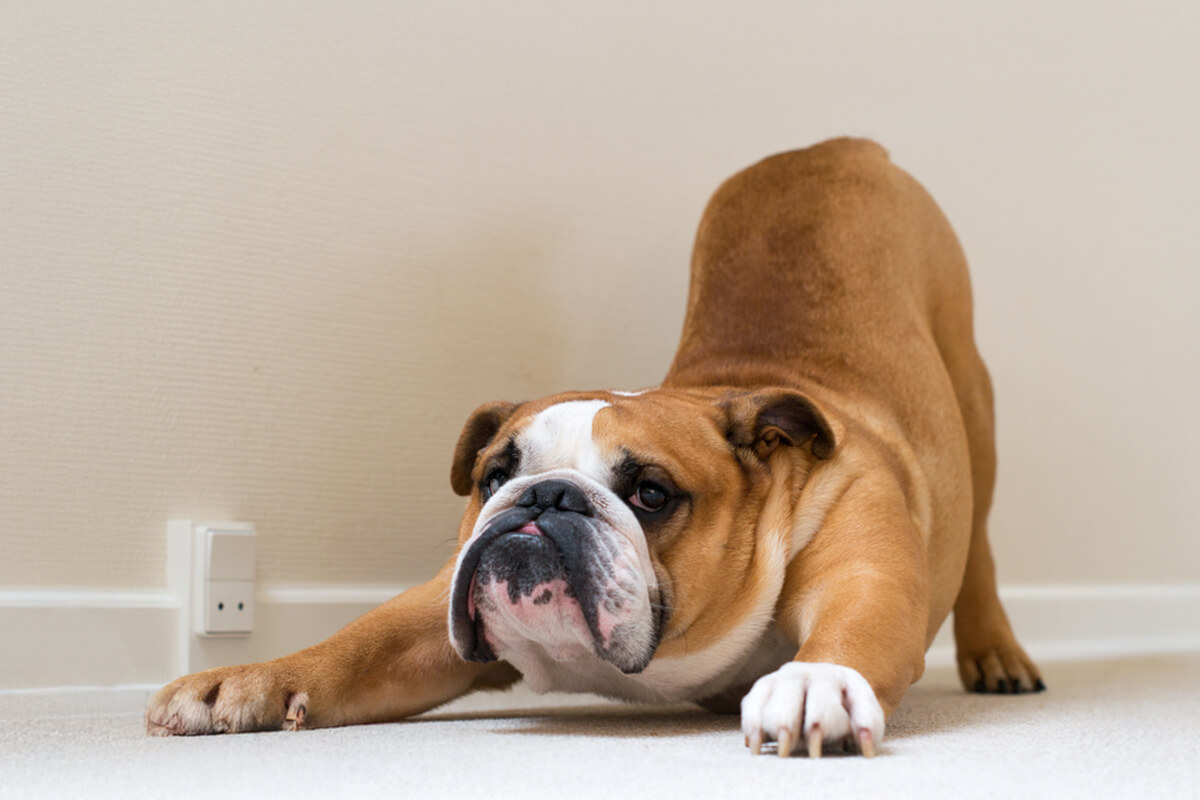 この姿勢は、強い腹痛を和らげようとする行動で、前足を地面につけて頭を下げ、後ろ足とお尻を高く上げる形になります。