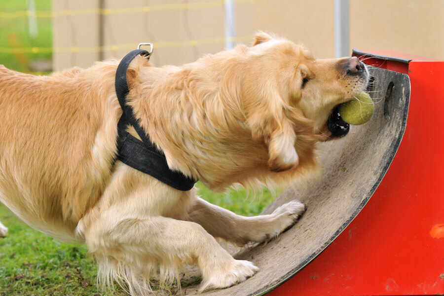 4つのハードルを飛び越えた先にあるボックスを前足で叩き、飛び出してきたボールを咥えながら再度ハードルを飛び越えます。