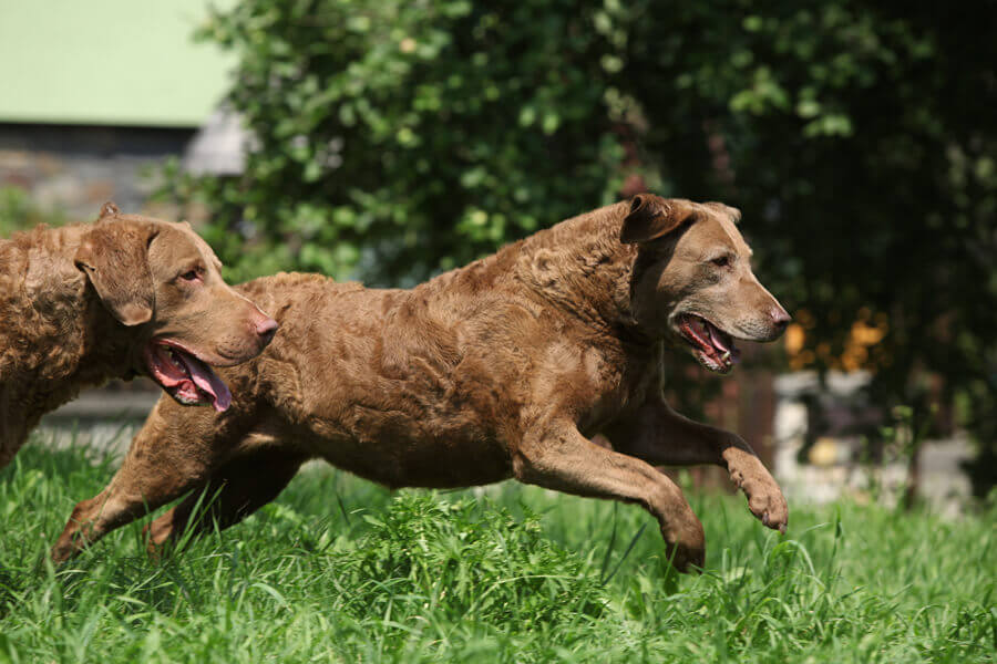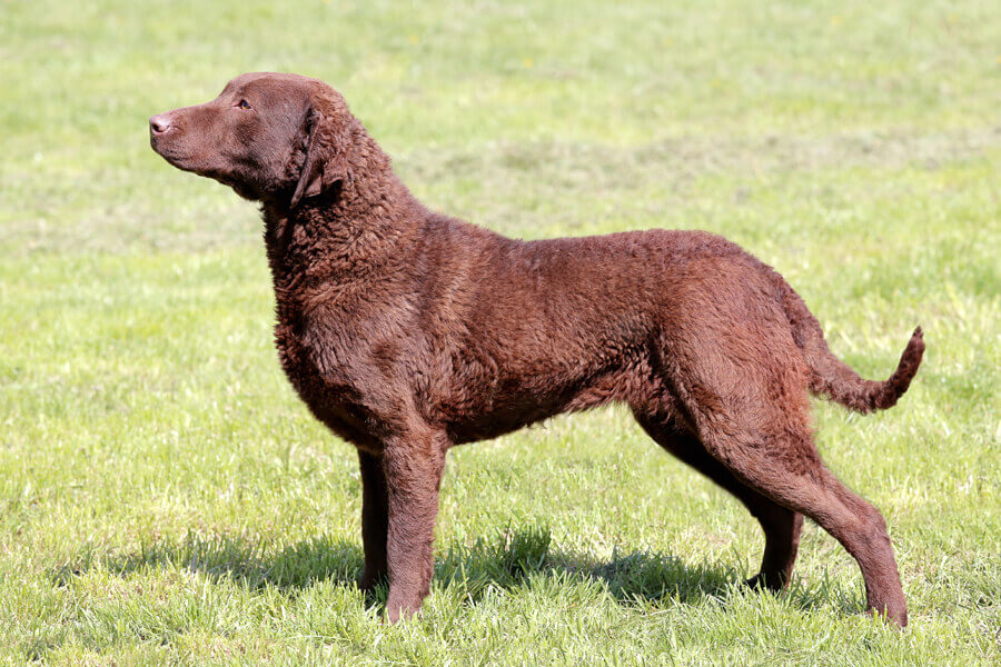 カールした被毛は防水効果ばつぐんで、がっちりした骨格とたくましい筋肉、そして寒さに負けない皮下脂肪を適度に併せ持っているチェサピークベイレトリバー。
